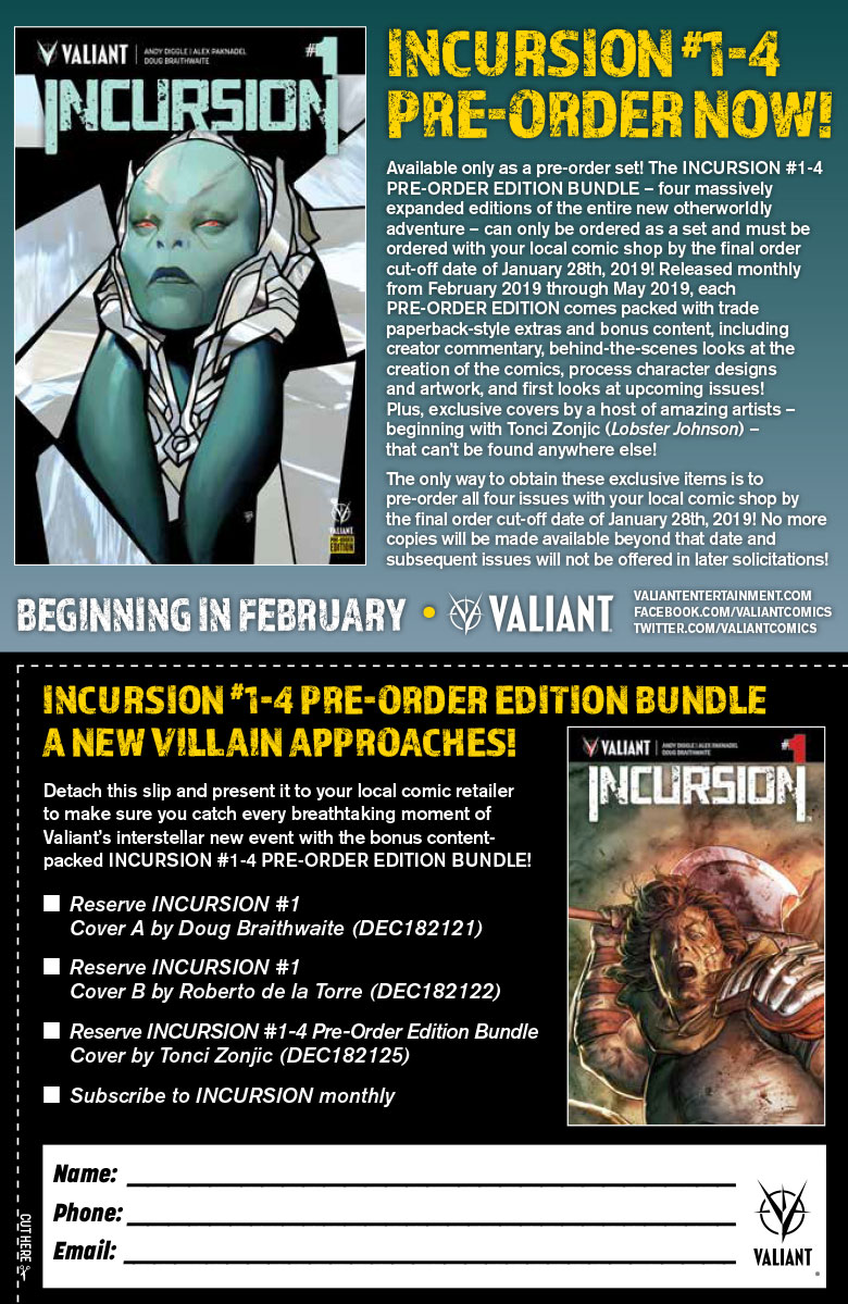 Valiant is proud to present the INCURSION #1-4 PRE-ORDER EDITION BUNDLE, available only as a set to fans who reserve the entire series with their local comic shop by the final order cut-off date (FOC) of January 28, 2019!