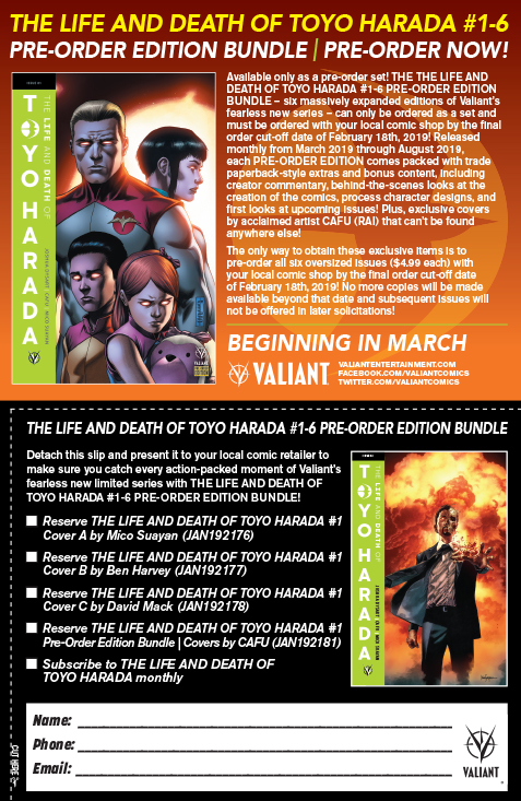 Valiant is excited to announce that THE LIFE AND DEATH OF TOYO HARADA – the much-anticipated limited series by Eisner Award-nominated writer Joshua Dysart (HARBINGER, HARBINGER WARS) and a lineup of all-star artists – including CAFU (RAI), Mico Suayan (BLOODSHOT SALVATION), Butch Guice (Captain America), Adam Pollina (SECRET WEAPONS), Diego Yapur (Priest: Purgatory), Kano (QUANTUM AND WOODY!), and Doug Braithwaite (INCURSION) – is available to pre-order now at comic book stores everywhere in advance of its March 13, 2019 premiere date!