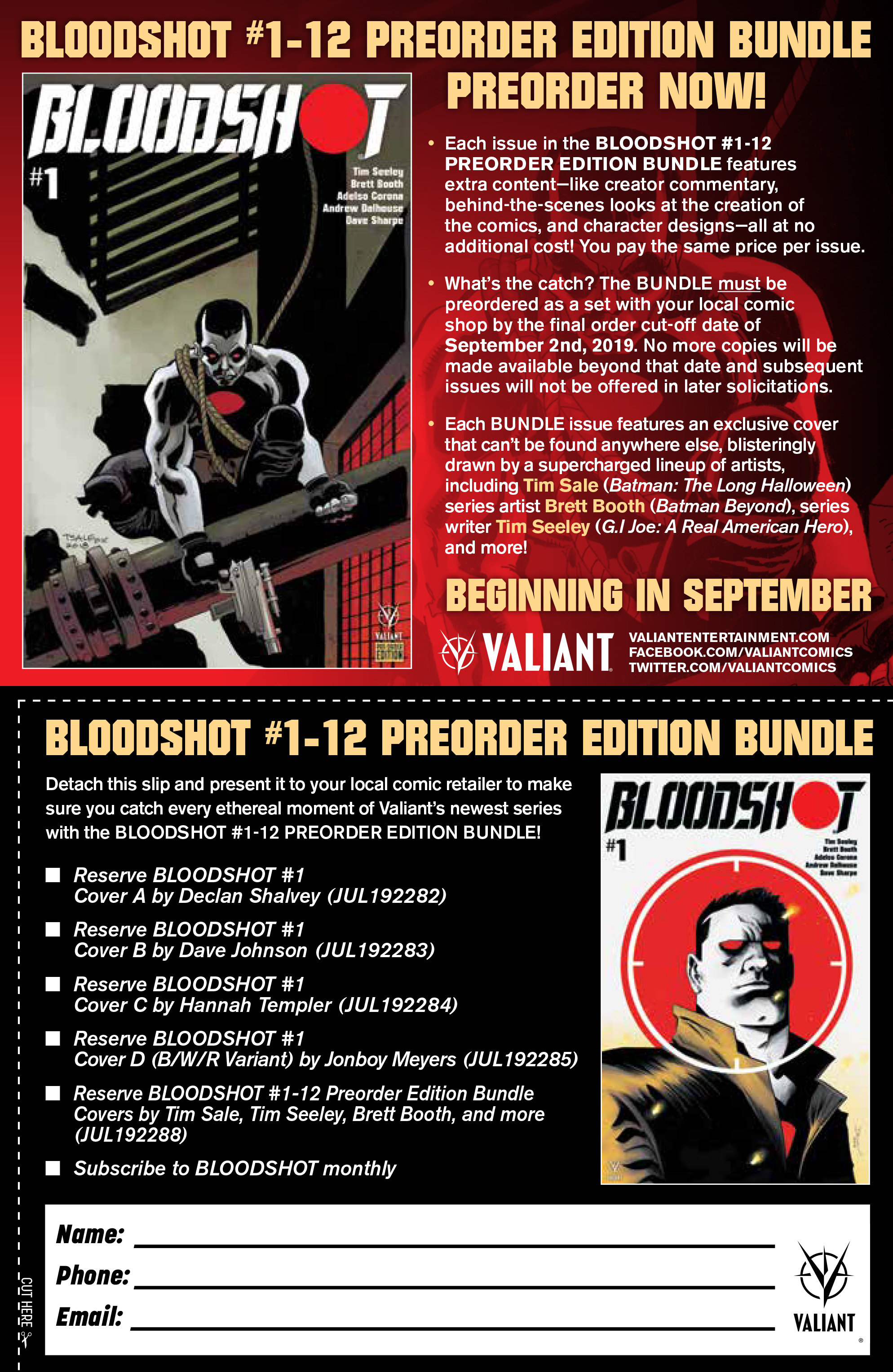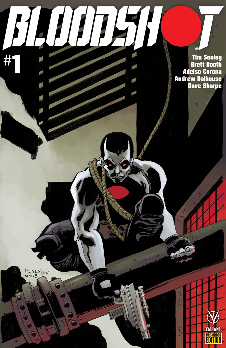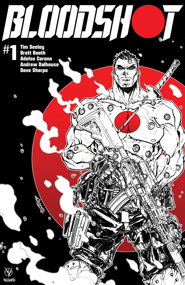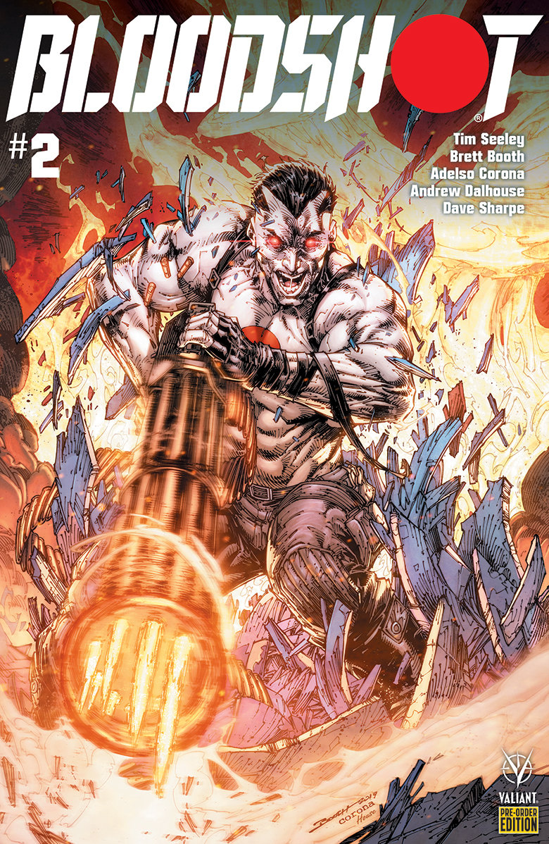 Valiant is proud to announce the BLOODSHOT #1-12 PREORDER EDITION BUNDLE, the latest in the publisher's initiative to allow readers to order a complete story arc or an entire run of a limited series in advance. The BLOODSHOT PREORDER EDITION issues will feature covers drawn by Tim Sale(Batman), Brett Booth (Teen Titans), Tim Seeley (Hack/Slash), and other amazing artists! In addition to the eye-catching covers, each monthly issue will contain eight extra pages that are packed with bonus features including creator commentary, behind-the-scenes looks at the creation of the comics, character designs, and more for just $3.99!