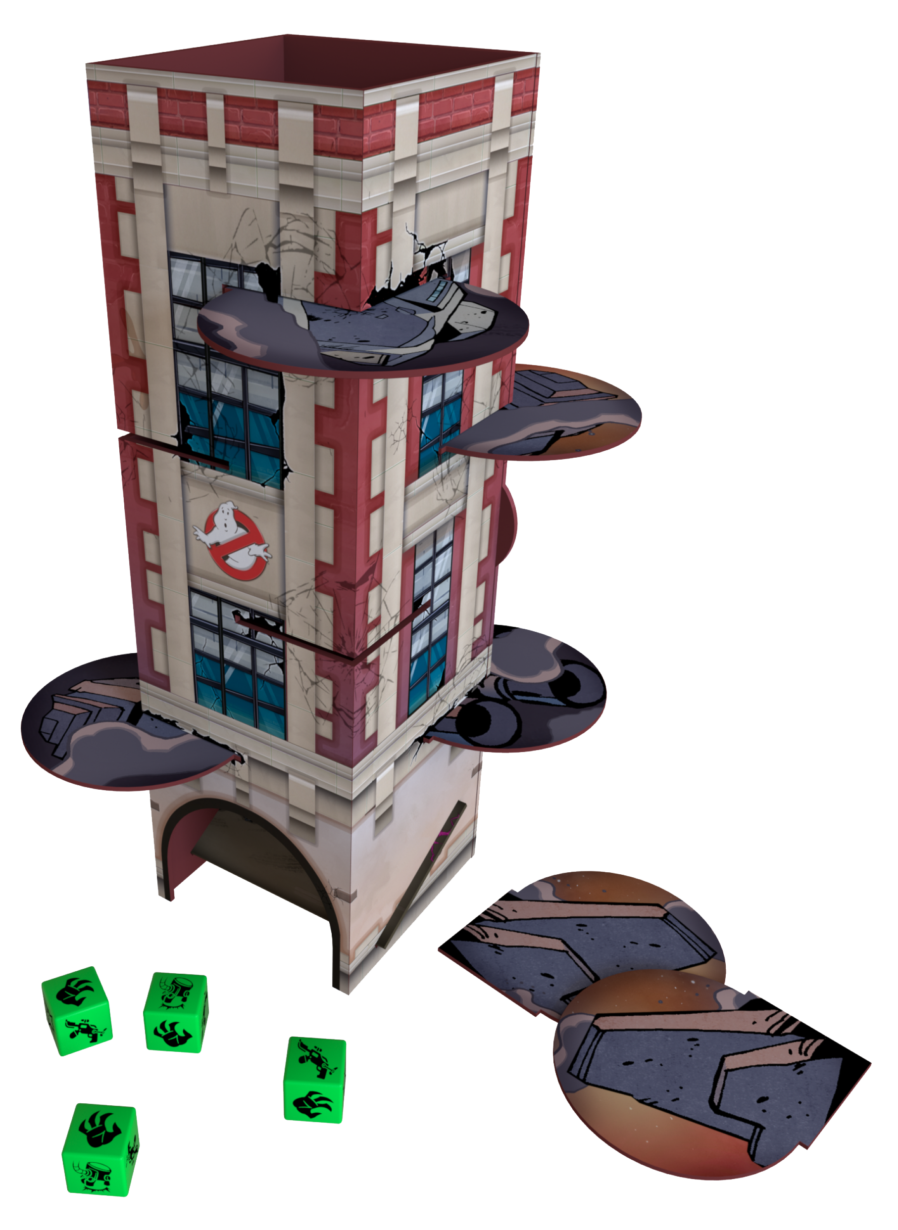 As players bust ecto-terrestrials and complete objectives, hot sheet cards will be drawn. Hot sheets will always contain a game altering event and an ecto-terrestrial icon. Each time an ecto-terrestrial icon is revealed, a corresponding track is filled. If any of the tracks become full, a ship piece must be removed from the firehouse. A multi-chamber dice tower, the firehouse has been riddled with ship pieces from the ecto-terrestrial’s crash landing. When a piece is pulled, any number of dice might spill out, indicating how many ecto-terrestrials and of which type will spawn around the map.