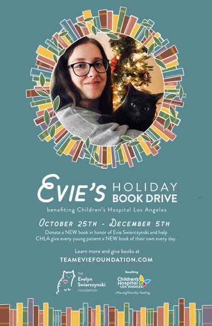 Last year, Evie’s Holiday Book Drive collected over 2,000 new books; we’re hoping to top 2,500 this time around. But to do that, we’ll need your help. If you visit teameviefoundation.com, you’ll find links to all four bookstores.