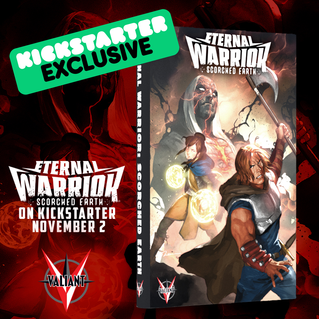 November 2nd, 2021 – ETERNAL WARRIOR: SCORCHED EARTH is Valiant Entertainment's first original graphic novel and debut Kickstarter campaign featuring the return of fan-favorite character Gilad Anni-Padda, the ETERNAL WARRIOR, and Tama, this generation's GEOMANCER of Earth as well as introducing an all-new threat to the Valiant Universe.