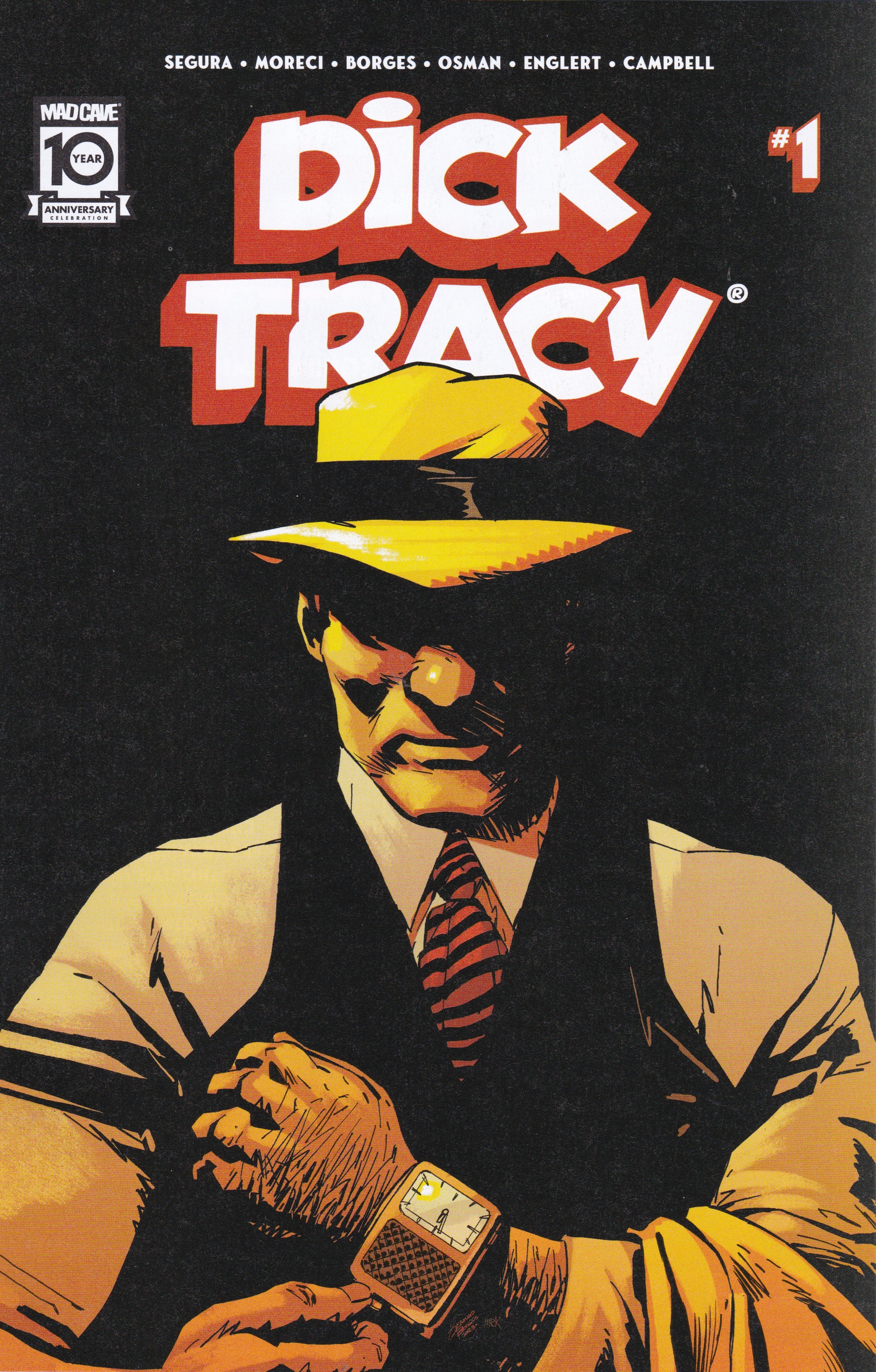 #330 DICK TRACY #1 by Alex Segura & Michael Moreci with art by Gerald Borges (Mad Cave Studios, April 2024) Dick Tracy is one of the oldest pop culture characters, dating back to creator Chester Gould’s newspaper comic strip in 1931. My first introduction to Dick Tracy occurred in the 1960’s when I read about him in the comics section of the Sunday newspaper. Also, the only comics in the waiting room of the barbershop my dad took me to were Harvey Comics: BABY HUEY, CASPER THE FRIENDLY GHOST, HOT STUFF, SAD SACK, JOE PALOOKA, and DICK TRACY. The Sunday newspaper color comics were more current (sort of), featuring Tracy’s two-way wrist radio/tv, the Space Coupe, Moon Maid, and aircars.